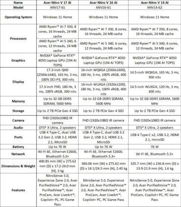 - Price: The lineup includes 5 laptop models starting with Nitro V 14 AI (ANV14-62)’s 1,099 EUR (about Rs 97,600) price tag and going all the way up to Nitro V 17 AI (ANV17-61) with EUR 1,299 (about Rs 1,15,400) price tag.
