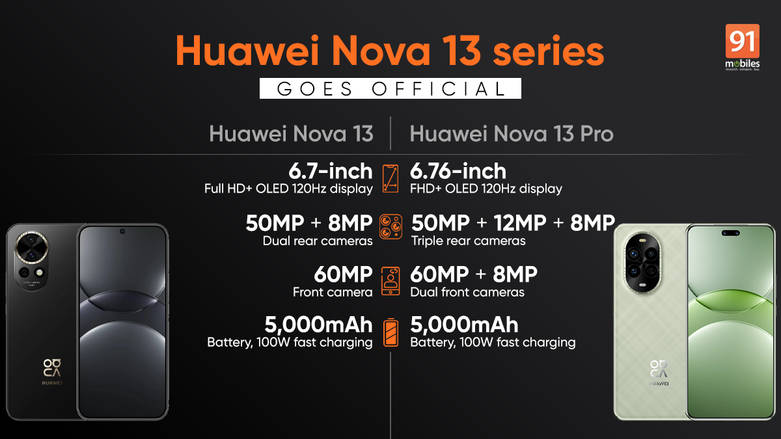 - Battery, charging: The Huawei Nova 13 series is equipped with a 5,000mAh battery and offers 100W wired fast charging support.