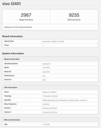 - The Geekbench listing, as spotted by MySmartPrice, reveals the model number I2401. The same phone also appeared on the TUV platform.