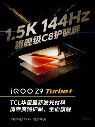 - The iQOO Z9 Turbo+ is confirmed to feature a TCL Huaxing C8 OLED straight screen with 1.5K resolution and a 144Hz refresh rate.