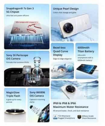 - Design: The device sports IP66+IP68+IP69 dust and water resistance. You also get military-grade shock resistance and TuV Rheinland durability certification. The appearance is called Pearl design which changes colour in cold temperatures.
