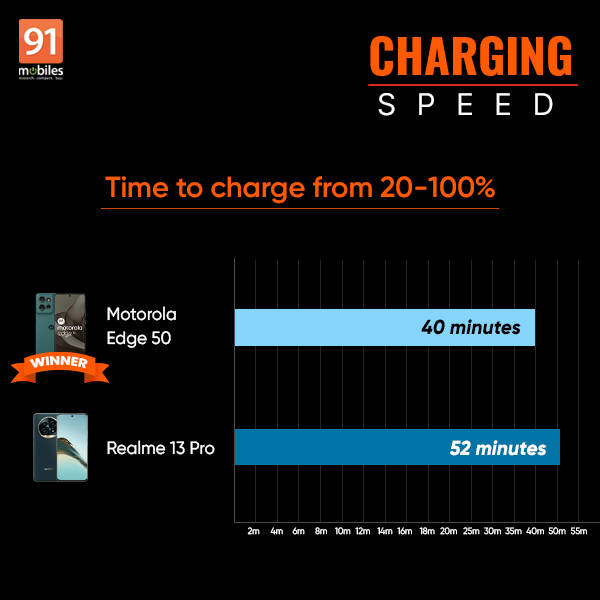 The Motorola Edge 50 supports 68W fast charging, while the Realme 13 Pro supports 45W. The Motorola Edge 50 takes 40 minutes to fully recharge from 20 percent capacity, while the Realme 13 Pro takes 52 minutes.