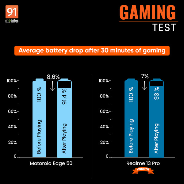 We played BGMI, COD: Mobile, and Real Racing 3 on both phones at similar volume and brightness levels. The Motorola Edge 50 showed an aggregate battery drain of 26 percent (8.6 percent average i.e, 430mAh) during the test, while the Realme 13 Pro indicated a lower battery drain of 21 percent (7 percent average i.e, 364mAh)