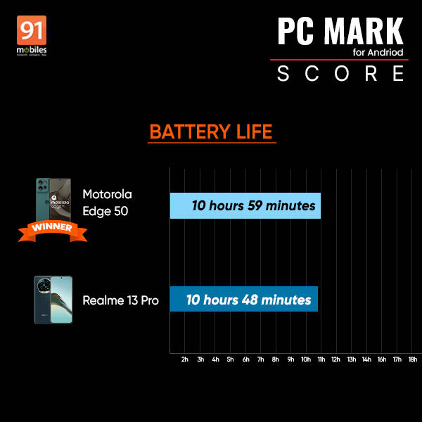 The PCMark Benchmark test measures the time it takes for a smartphone’s battery to drop from 100 percent capacity to under 20 percent. We ran the test at 80 percent brightness to simulate real-world usage. The Motorola Edge 50 took a total of 10 hours and 59 minutes to drop below the threshold capacity, compared to the Realme 13 Pro, which took 10 hours and 48 minutes.