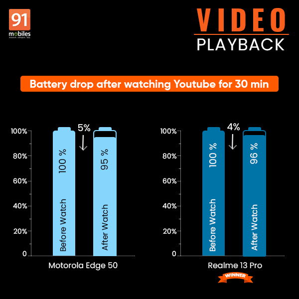 Based on the test, the Realme 13 Pro’s battery is more efficient during video playback. The slightly higher battery drain in the Motorola Edge 50 could be due to poorer thermal management.