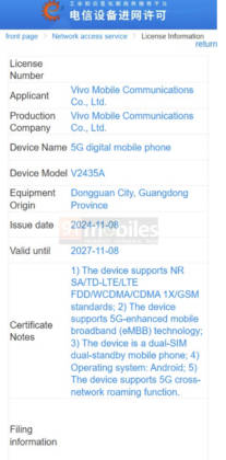- 91mobiles spotted the Vivo V2435A smartphone on the MIIT (Ministry of Industry and Information Technology) website.