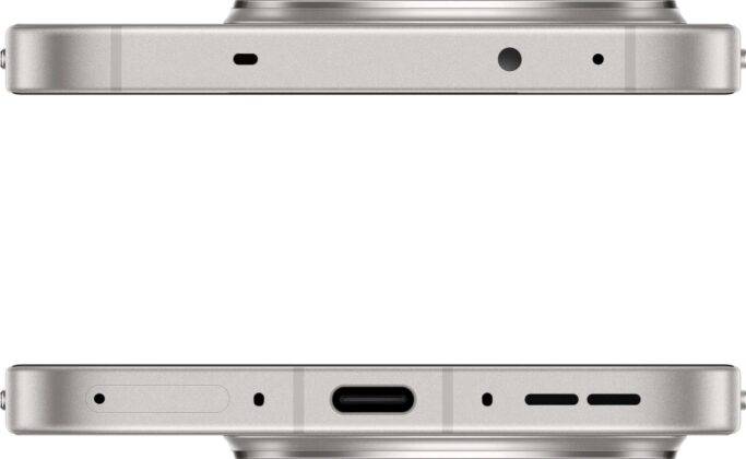 - The SIM tray section, USB Type-C port, speaker vents and microphone are at the bottom.