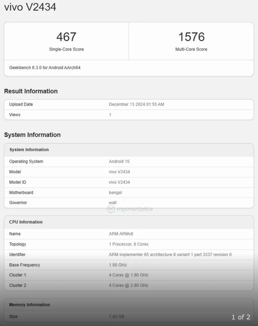 - The Vivo Y29 4G carries the model number V2434 on the Geekbench database which is similar to the EEC certification.