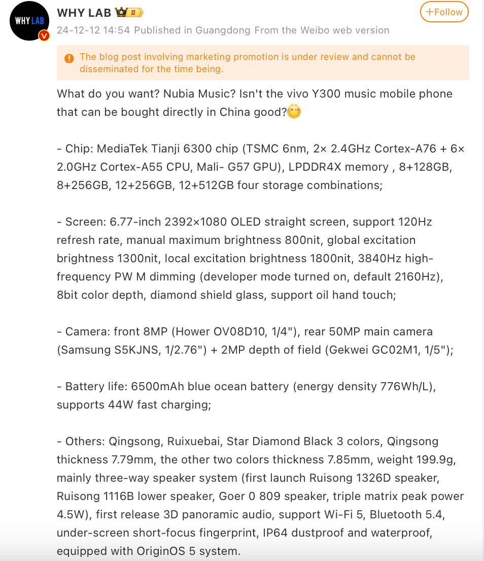 - Other features on the Y300 5G are said to include IP64 rating, WiFi-5, and Bluetooth 5.4