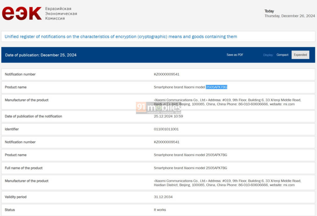 Xiaomi Mix Flip debuted as the company’s first clamshell folding phone in July 2024 in China. The company seems to be working on the successor now. 91mobiles has spotted Mix Flip 2 on the Russian certification body EEC website. Although the listing reveals only the model number, it can be identified as the phone in question since the same model previously appeared in the IMEI database. In related news, the Xiaomi sub-brand POCO’s F7 Pro global edition has been spotted on UAE’s TDRA website. This phone has already been visiting other certification sites like the US’s FCC, Singapore’s IMDA, and the IMEI database.